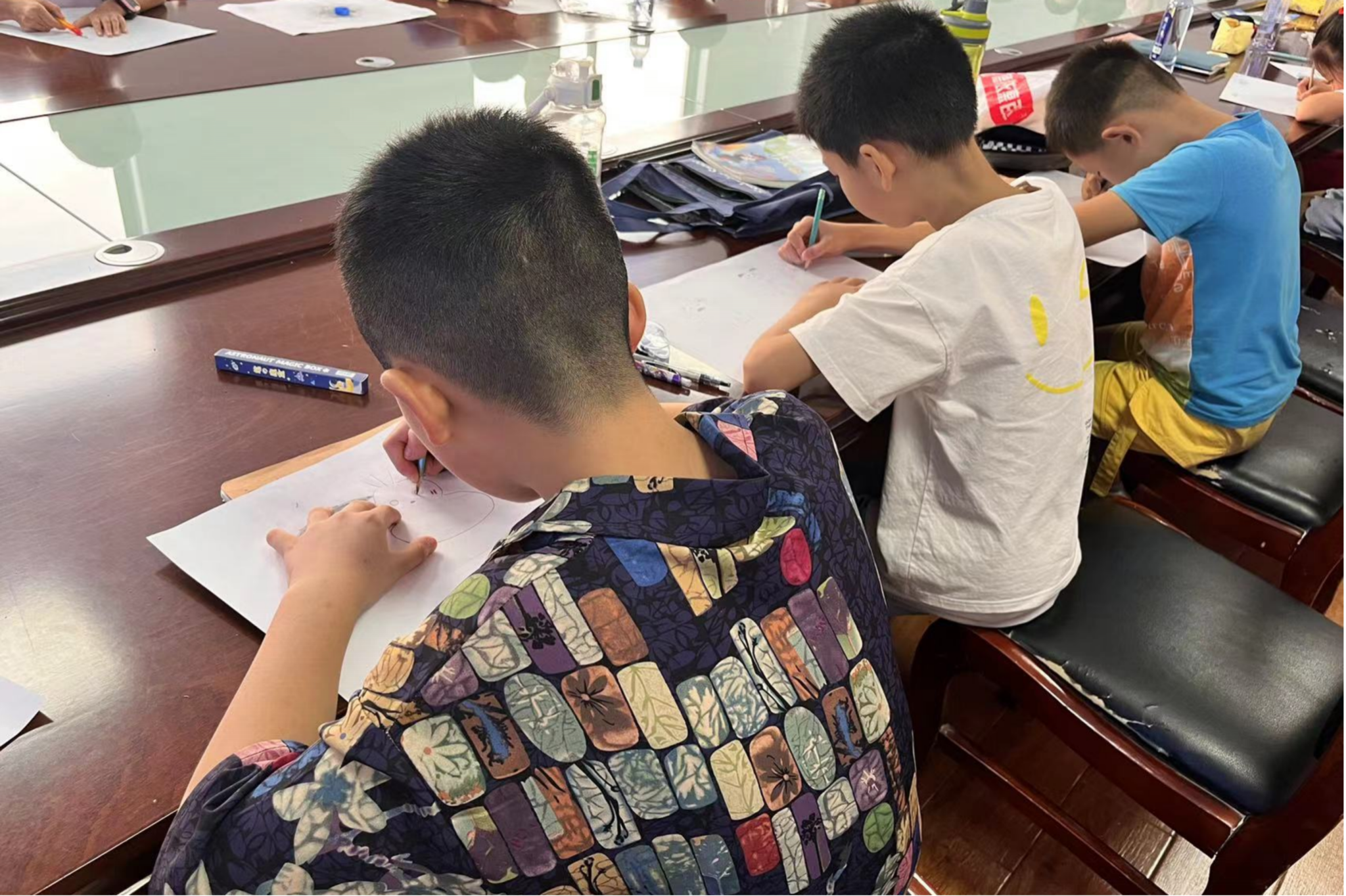 授课正式开始。第一节课是美术课,实践团成员姜璐瑶担任主讲人,和两位授课一组的成员一起指导同学们用画笔描绘家乡、梦想或卡通形象,引导同学们展示丰富多彩的内心世界。