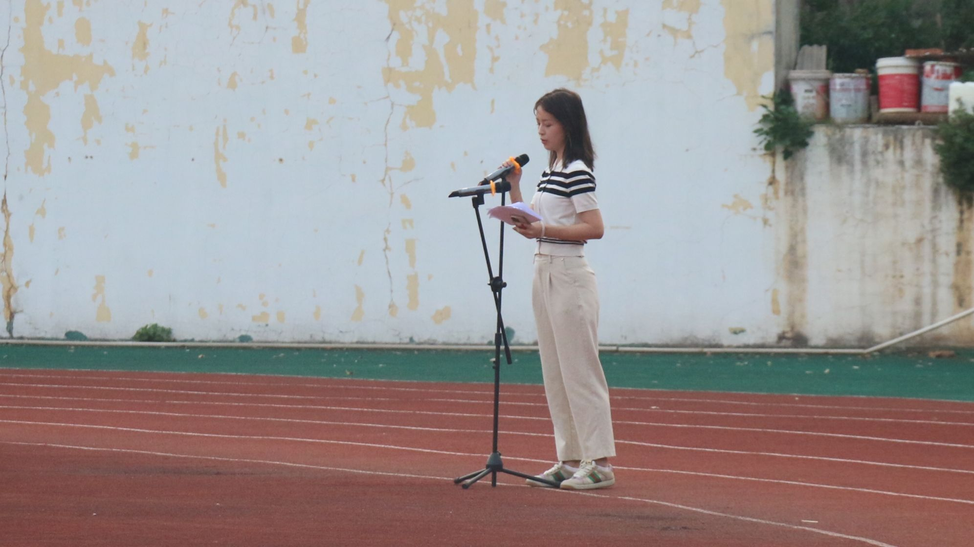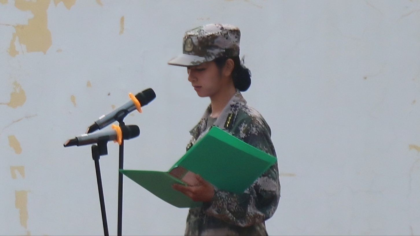 教官代表彭睿敏在国旗下发言,她强调:军训期间要听从指挥,努力达到训练标准,严格要求自己,教官会以身作则,以上率下。