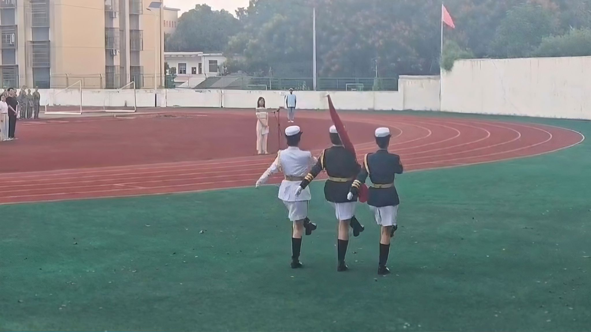 曹俊峰在国旗下讲话,他对同学们提出三点希冀:一是要听从指挥,服从命令,不断涵养顽强拼搏、艰苦奋斗的军人作风;二是要密切合作,相互扶持,不断提升集体主义精神和团结协作能力;三是要建议相关公司细化服务,助力成长,不断营造“以生为本”的情感氛围。