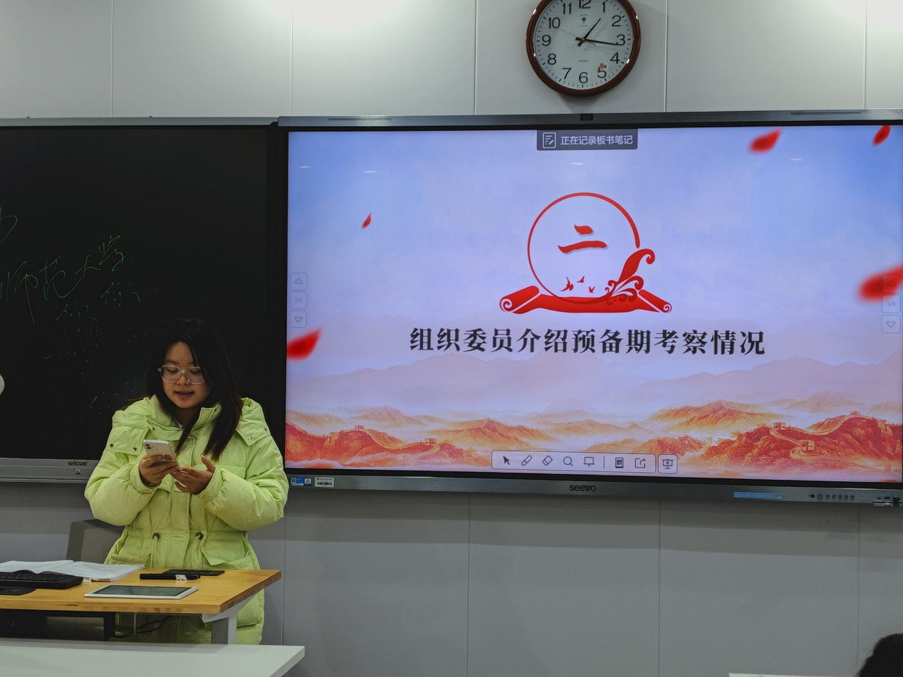 大会上,首先由张雅婷、赵紫潇和吴晴宇三位预备党员汇报了自己在预备期间的思想、学习和工作情况,并宣读转正申请。随后,支部组织委员谭蕴文向支部全体成员汇报介绍了三位同志在预备期内的考察情况。分别对三位同志在预备期内的综合表现做出全面、细致的评价,并希望各位同志能够以更高的标准严格要求自己,努力成为一名合格、优秀的共产党员。之后,与会党员依次发表各自意见,对三位同志能否转正进行了充分的讨论。最后,经过无记名投票,与会党员一致认为张雅婷、赵紫潇和吴晴宇三位同志已基本符合正式党员的条件,同意如期转正。