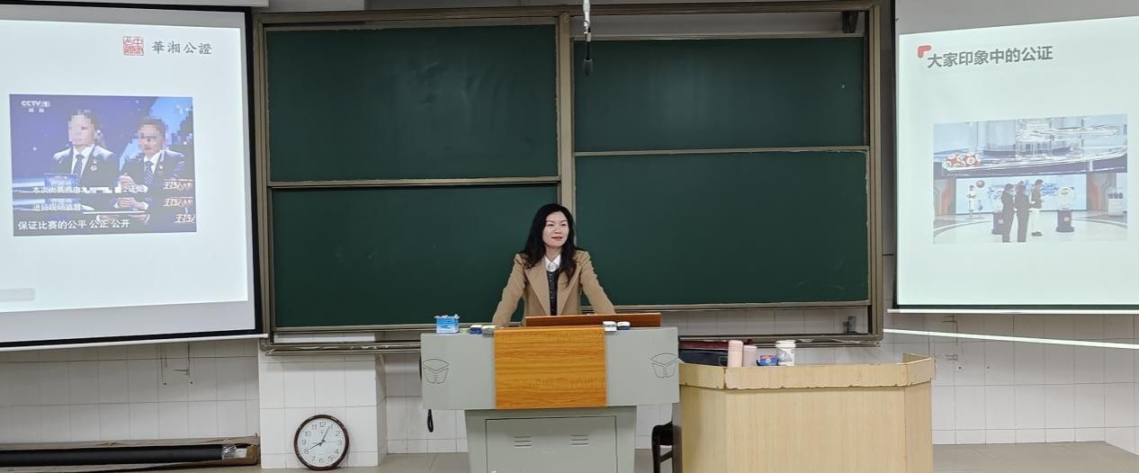 陈婷主任首先以生动的案例为切入点,向同学们展示了公证职业的多元性与重要性。她将公证比喻为“法律安全工程师”“社会治理参与者”和“公共权益守护者”,强调公证在预防法律纠纷、维护法治建设等方面具有重要作用。公证不仅涉及传统的合同、遗嘱等领域,还在知识产权保护、跨境文书认证、数字版权保护等方面发挥着关键作用。陈婷主任指出,公证行业相较于律师行业具有更少的内卷和更高的社会认可等优势。长沙市律师人数众多,而公证员数量相对较少,这为有志于从事公证工作的法员工提供了广阔的发展空间。她强调,公证行业是一片“蓝海”,并鼓励同学们抓住这一机遇。