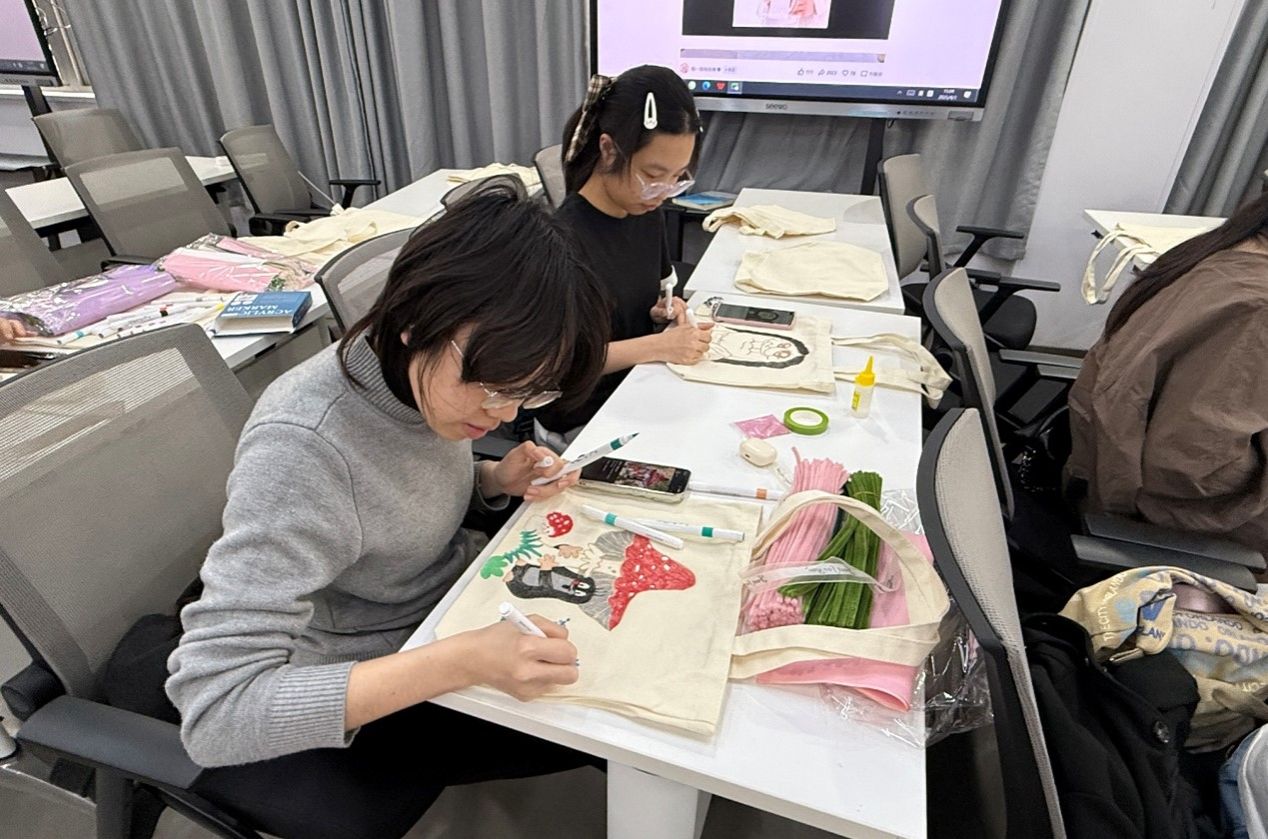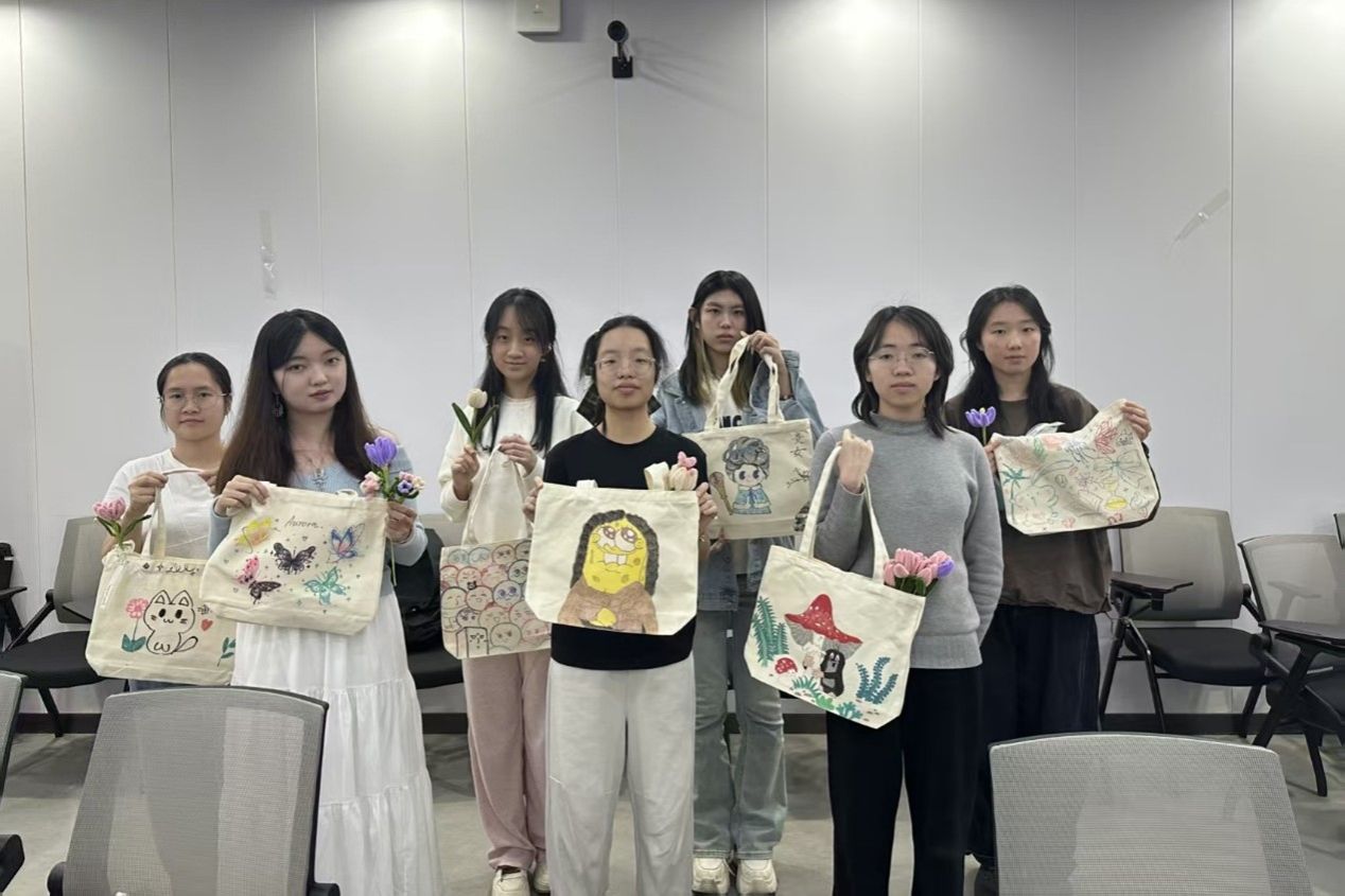 本次心理微团辅活动突出手工制作、独立创作与集体合作的三个特征,主要分为两个部分:帆布包画画和制作花束扭扭棒,意在让同学们通过双手将自己脑海中的想象变为现实。在员工会学业发展部相关同学的带领下,大家首先进行了帆布包画画这一活动,同学们使用专业的丙烯马克笔在帆布包上释放自己的灵感,最终都完成了令自己满意的作品;第二个部分则是花束扭扭棒的制作,同学们在轻松愉快的氛围里相互配合,一起学习用扭扭棒制作郁金香花束。