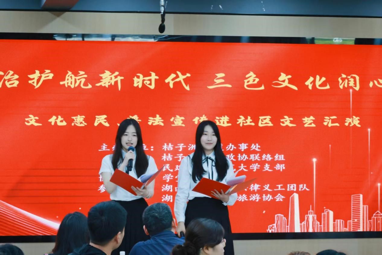 此次文艺汇演中,法律义工团队的队员们自编自导自演了情景剧、朗诵、三句半等节目,将法治宣传与文艺表演巧妙结合。革命情景剧《百年回声—沁园春•长沙》通过杨开慧的革命事迹,生动展现了湖湘儿女的爱国情怀。反诈情景剧《守住钱袋子》以独居老人受骗的真实案例为原型,深刻揭示了常见诈骗手法。三句半《法润万家三句半》将枯燥的法律条文转化为通俗易懂的语言,让观众在轻松愉快的氛围中学习法律知识。情景剧《普法进行时》通过一系列小故事,展现了法律在维护邻里和谐、解决生活矛盾中的重要作用,倡导理性处理纠纷,共建和谐社会。相声《绿色之旅》则以幽默诙谐的方式倡导文明旅游理念。