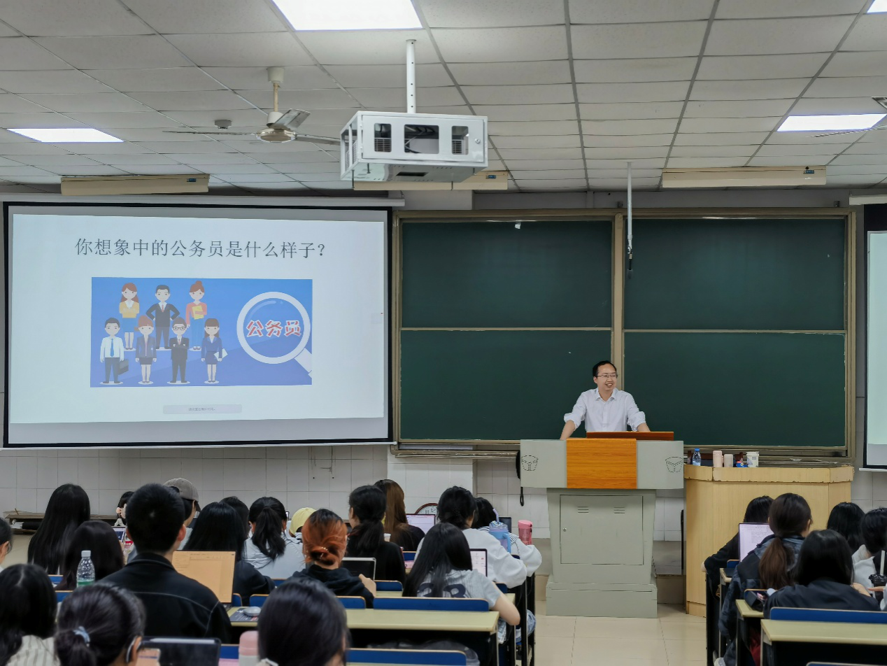 讲座伊始,黄俊峰处长通过提问互动的方式,了解同学们对公务员职业的直观感受。不少同学认为公务员上班轻松、工作稳定。针对这些看法,黄俊峰处长指出,社会上对公务员职业存在诸多误解,“宇宙的尽头是编制”等说法虽然流行,但大家应理性看待公务员职业。