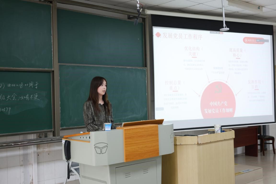 胡钰琬介绍党员发展流程。她从端正动机、熟悉流程、思想认知和行动指引四个方面对党员发展流程进行了详细讲解,指出同学们应从思想、认知和责任上端正入党动机,主动向党组织靠拢。随后,她针对同学的疑惑进行了解答。