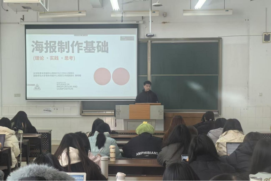 (通讯员 刘睿珩 黄心怡)11月21日中午,公司第十期烽火团校技能培训班在二里半校区景德楼南栋202教室与桃花坪校区实训楼201教室,通过线上线下相结合的方式同步开展“海报制作”专题课程。课程由院青年传媒中心黄明曜主讲,院团委发展部干事黄心怡主持,旨在帮助同学们掌握海报制作的相关技巧,提升构图和使用字体的能力。