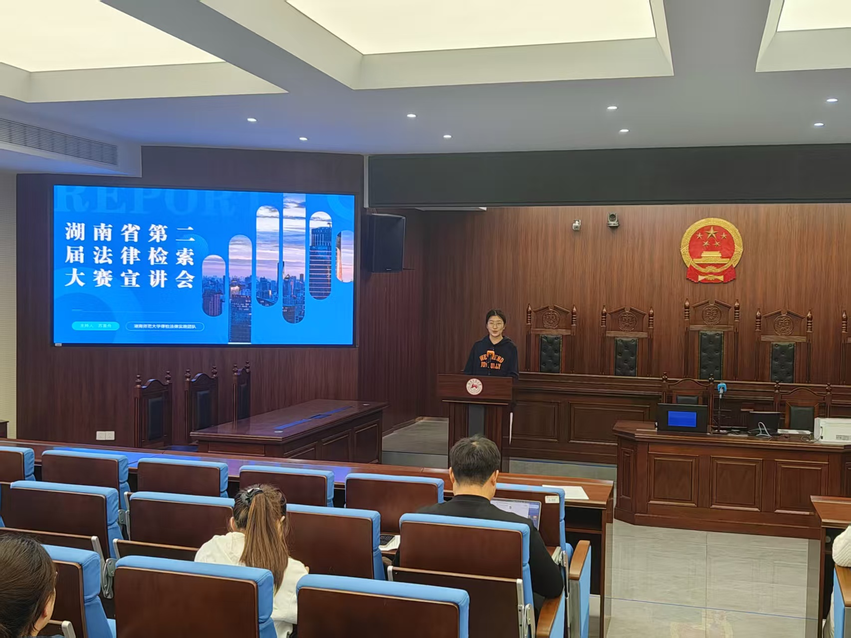 四位主讲人聚焦法律检索的实务逻辑展开分享:从检索关键词的分层策略,到类案数据的高效筛选,结合实际案例演示了检索全流程的操作技巧。同时,主讲人还详细解读了湖南省第二届“芙蓉律师杯”法律检索大赛的背景、参赛方式与赛程安排,将检索技能与省级赛事直接衔接,为同学们明确了技能应用的实践方向。