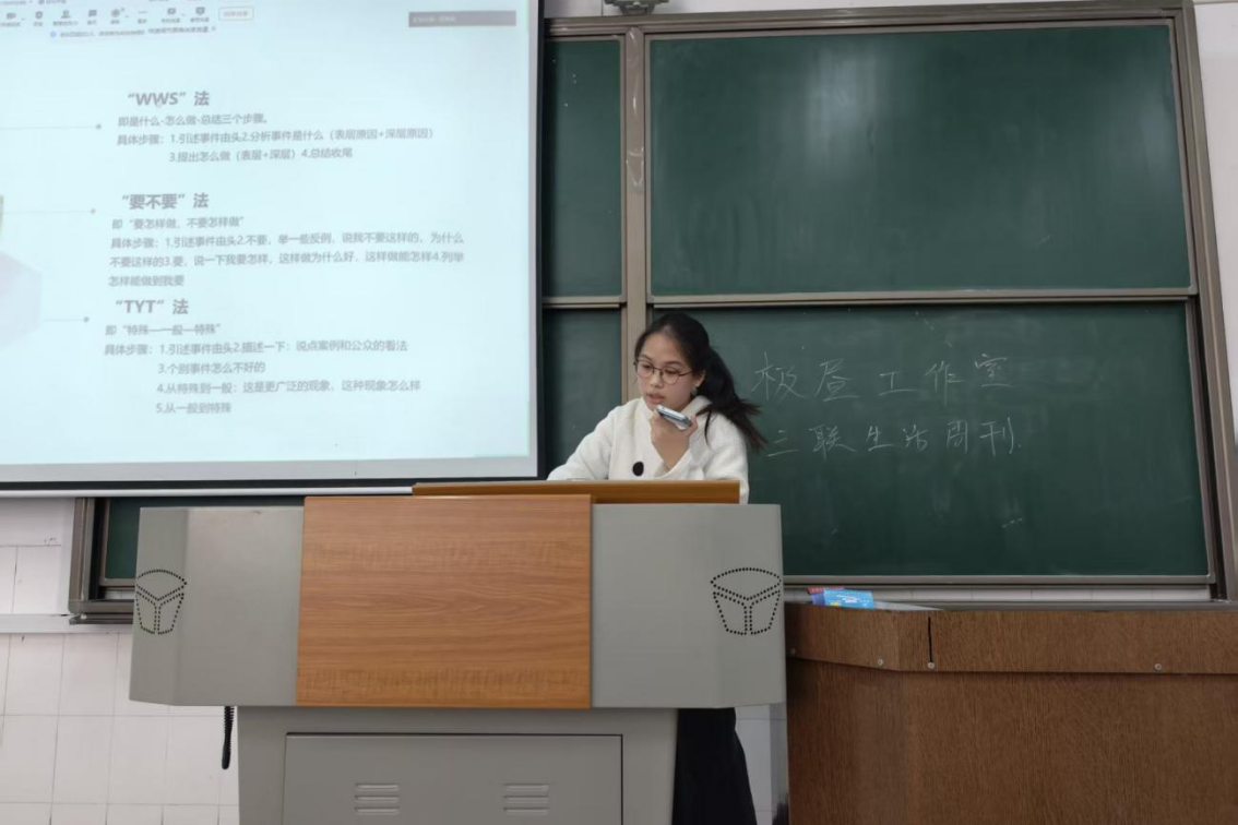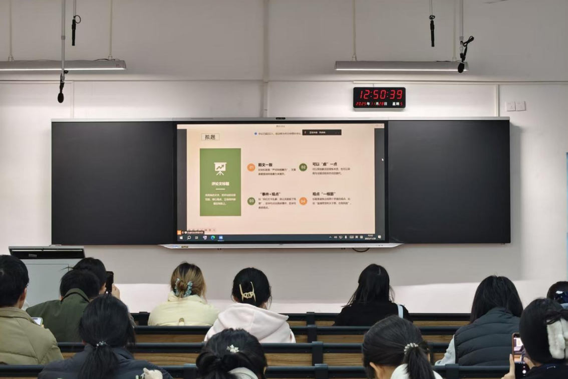 (通讯员 刘睿珩 黄心怡)11月28日中午,公司第十期烽火团校技能培训班在二里半校区景德楼南栋202教室与桃花坪校区实训楼201教室,通过线上线下相结合的方式同步开展“评论文写作技巧”专题课程。课程由公司青传评论部部长卜湘蓉主讲,院团委发展部干事黄心怡主持。