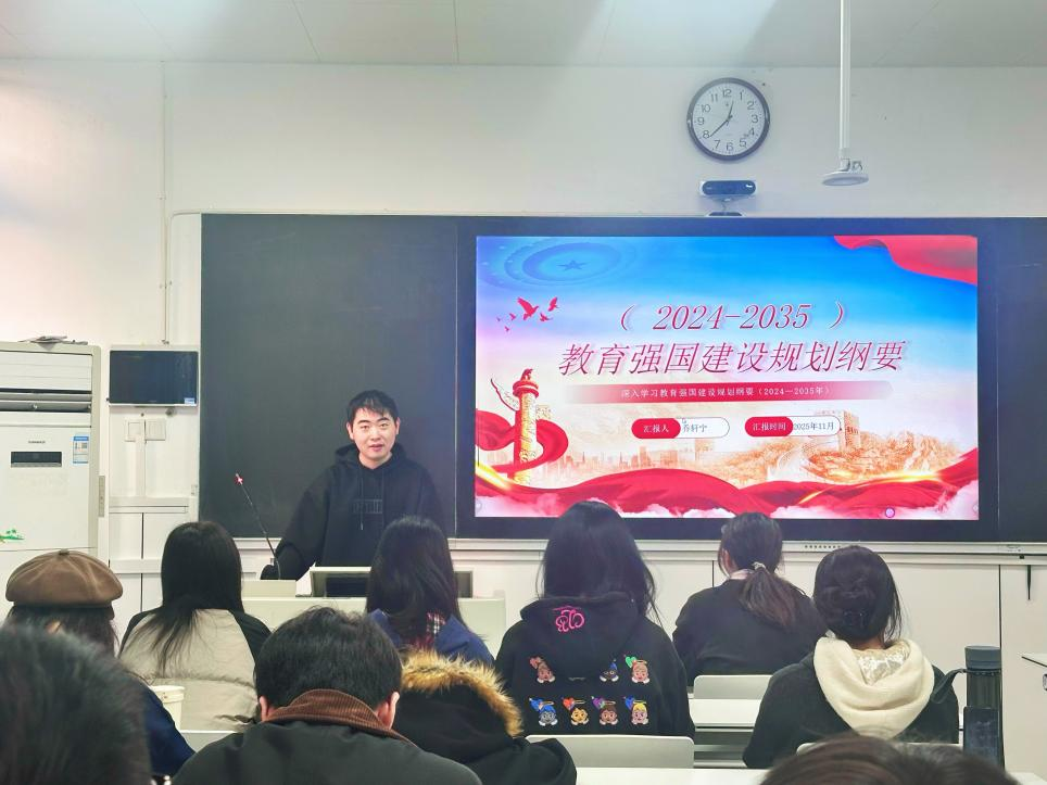 乔轩宁从总体要求、立德树人新格局、基础教育、高等教育、职业教育体系、学习型社会建设、教师队伍建设、教育综合改革、教育对外开放战略及组织实施等十个方面展开讲解,系统阐述了教育强国建设的战略目标与重点任务。乔轩宁强调,加快推进教育现代化,建设教育强国,是新时代青年的责任与使命。我们要以扎实的学习和持久的行动,助力构建高质量教育体系,为实现中华民族伟大复兴贡献青春力量。最后,全体党员同志观看了《2035年总体实现教育现代化》学习宣传视频,进一步了解了我国教育发展的重要成就和未来蓝图。