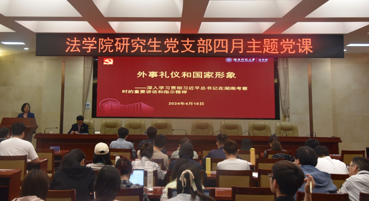 (通讯员 陈思怡 邓唐皓)4月18日下午,为深入学习贯彻习近平总书记在湖南考察时的重要讲话和指示精神,提高研究生党员的政治素质,培养具有家国情怀和国际视野的研究生党员,beats365教工第四党支部联合研究生七个党支部,在公司205报告厅开展beats365研究生党支部四月主题党课,公司党委书记唐建文以“外事礼仪和国家形象——深入学习贯彻习近平总书记在湖南考察时的重要讲话和指示精神”为主题,为师生讲授党课。本次党课由公司副经理何燕华主持。