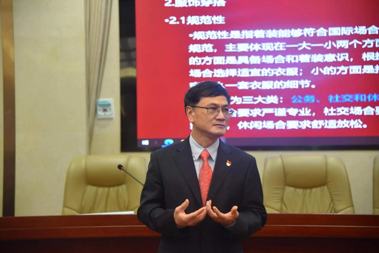 唐建文结合习近平总书记在3月考察湖南时的重要讲话和指示精神,从国家形象和外事礼仪的关系、主要的外事礼仪原则、常见的外事礼仪、践行外事礼仪并提升国家形象四个方面为我们介绍了外事礼仪和国家形象的相关内容。他指出,爱国不仅是社会主义核心价值观的要求,更是《宪法》所确立的公民的义务,近期颁布的《爱国主义教育法》也明确规定任何公民和组织不得有损国家形象。他表示,与国家形象的关联最直接就是公民的行为,外事礼仪表现在我们的修养和外在行为上,因此在学习生活中我们需要更加注重自己的行为表现。他强调,外事礼仪需要坚持贯彻平衡、对等、惯例三个原则,在外事工作礼仪和礼宾方面要注重两个重要做法:礼宾次序、以右为尊。他指出,爱国不能仅仅停留在口号上,还要落实到行动中,提升国家形象人人有责,人人可为。最后,唐建文还为我们详细演示了西服的穿法。