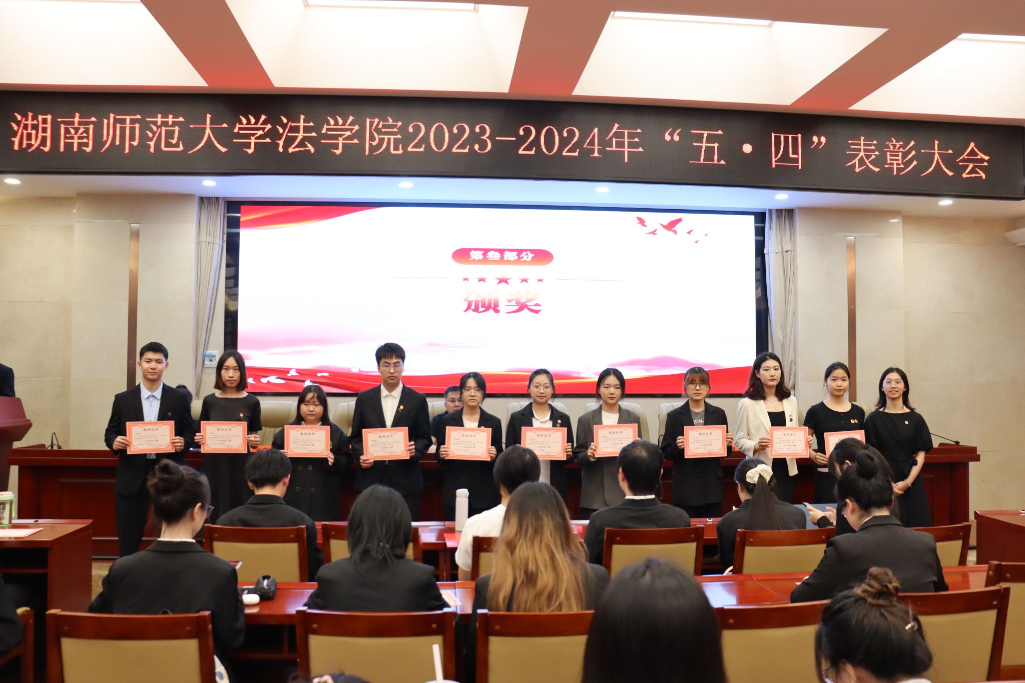 大会伊始,全体奏唱国歌。王丹宣读五四表彰决定。各位领导老师向获奖员工颁发荣誉证书,并分别合影留念。本科生获奖代表林力、研究生获奖代表罗雅萱依次发表获奖感言。她们分享了各自在大学的学习经历与心得体会,同时鼓励同学们勇担青年之责,共同建设法治中国。