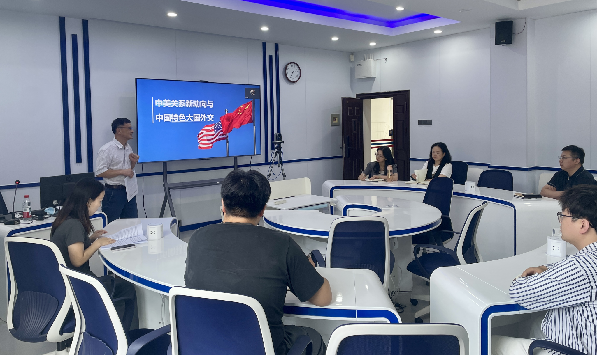 接着,他围绕“中美关系新动向与中国特色大国外交”,深入解读了中美关系的最新进展,他指出,中国以相互尊重为前提、和平共处为底线、合作共赢为目标,坚持不懈探索中美两个大国之间正确相处之道。他表示,中国积极投身于完善全球治理体系,通过践行真正的多边主义,成为全球治理进程中的重要稳定力量。他强调,在复杂多变的国际形势面前,党员要时刻保持对国际局势和时事政治的高度关注,拓宽国际视野,在各自岗位上奋勇争先,为实现中华民族伟大复兴的中国梦贡献青春力量。