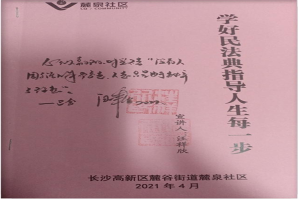 二、为了提高社区广大居民学法、守法、尊法的法律意识,我紧密联系社区广大居民的需求,结合《民法典》中的有关条款,撰写了《学好民法典指导人生每一步》讲稿,在社区内外进行宣讲。