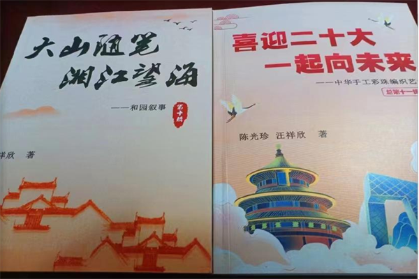 四、为了提升社区居民的文化审美观,我与老伴陈光珍利用社区提供的场地,办起了《女红工艺梦幻工作室》。在工作室内,充分发挥老伴能工巧匠的作用,免费为社区女红工艺爱好者提供学习中国优秀民间传统工艺“中国结”“串珠”“絲网花”“剪纸”等工艺品的制作技巧。我将学员们学习的一个个精彩镜头收集整理编写了《夕阳情深献余热,只为社区花更红》一书,奉献给广大读者,让非遗传承在社区内外开花结果。