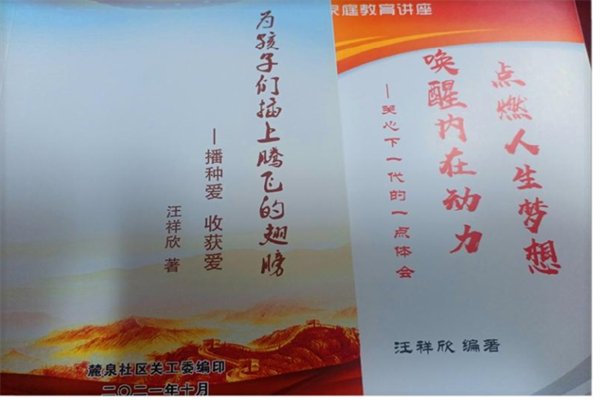 三、为了提升孩子们的学习自觉性和克服学习中的畏难情绪,联系家长们反映的孩子们身上普遍存在的突出问题,我撰写了《为孩子们插上腾飞的翅膀》《点燃人生梦想唤醒内在动力》等课外读本,在社区内外和《汪嗲工作室》内不定期进行有针对性的授课,为需求的家长孩子们提供帮助。